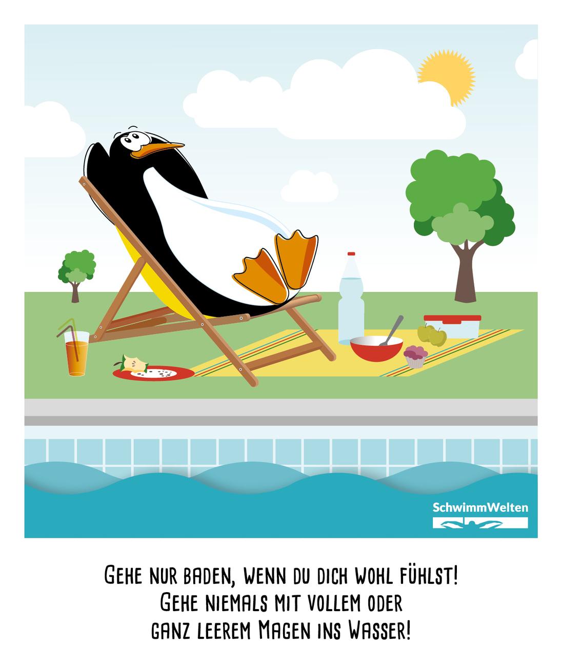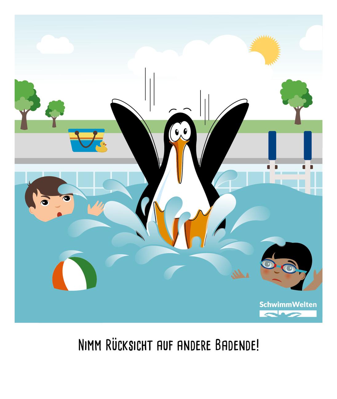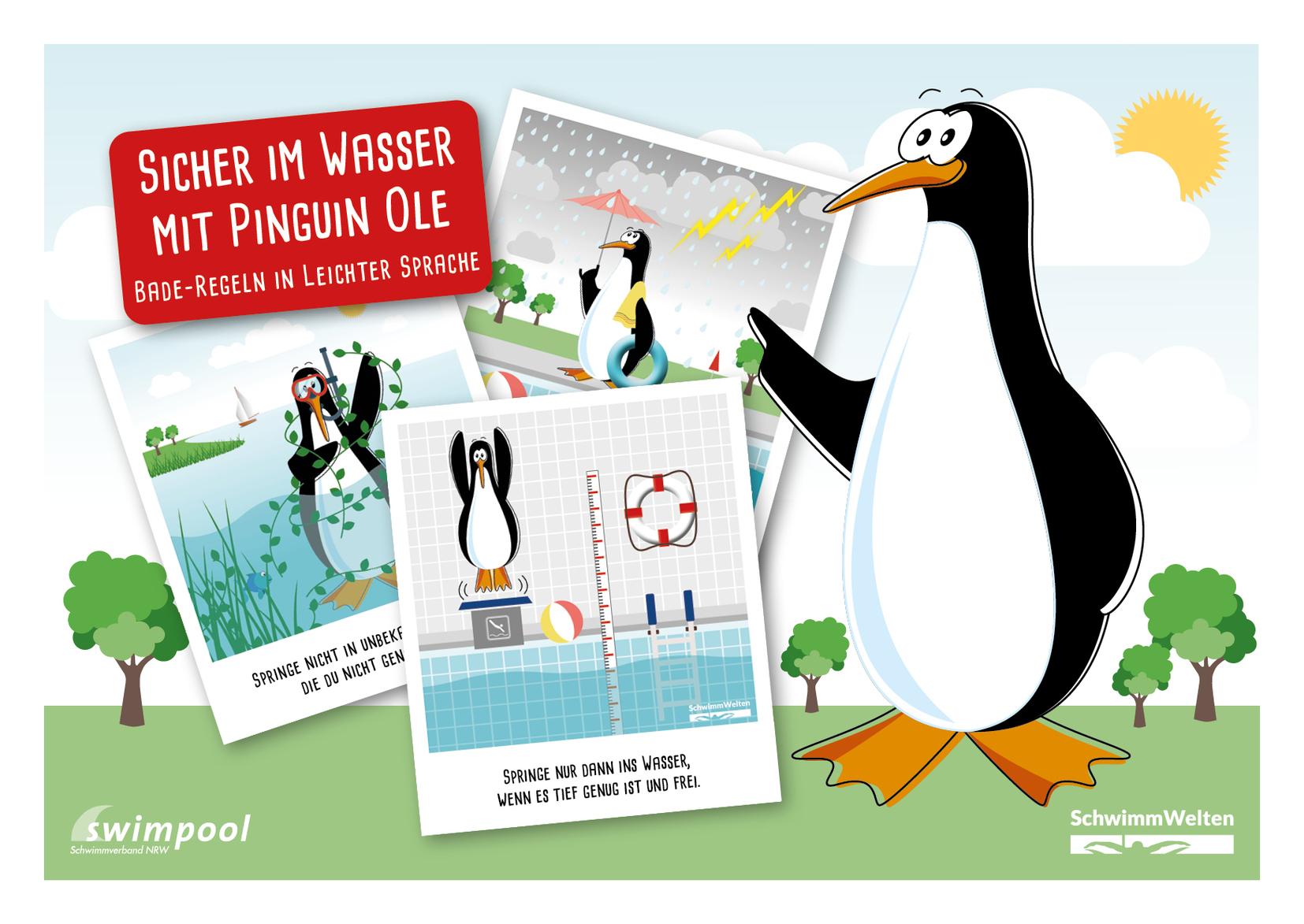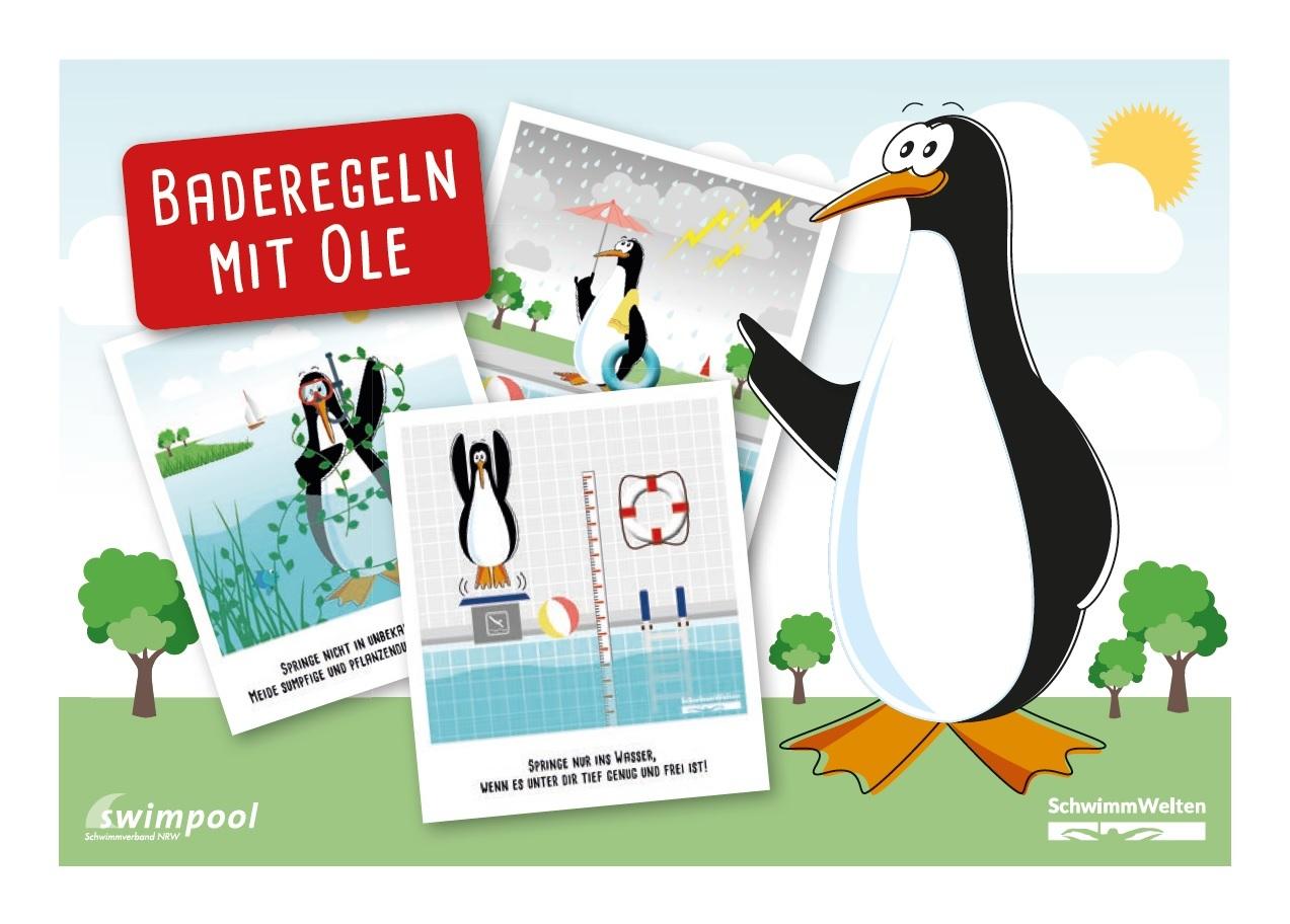 Hier findet ihr die wichtigsten Baderegeln, präsentiert von Pinguin Ole, dem Maskottchen des Schwimmverbandes Nordrhein-Westfalen.