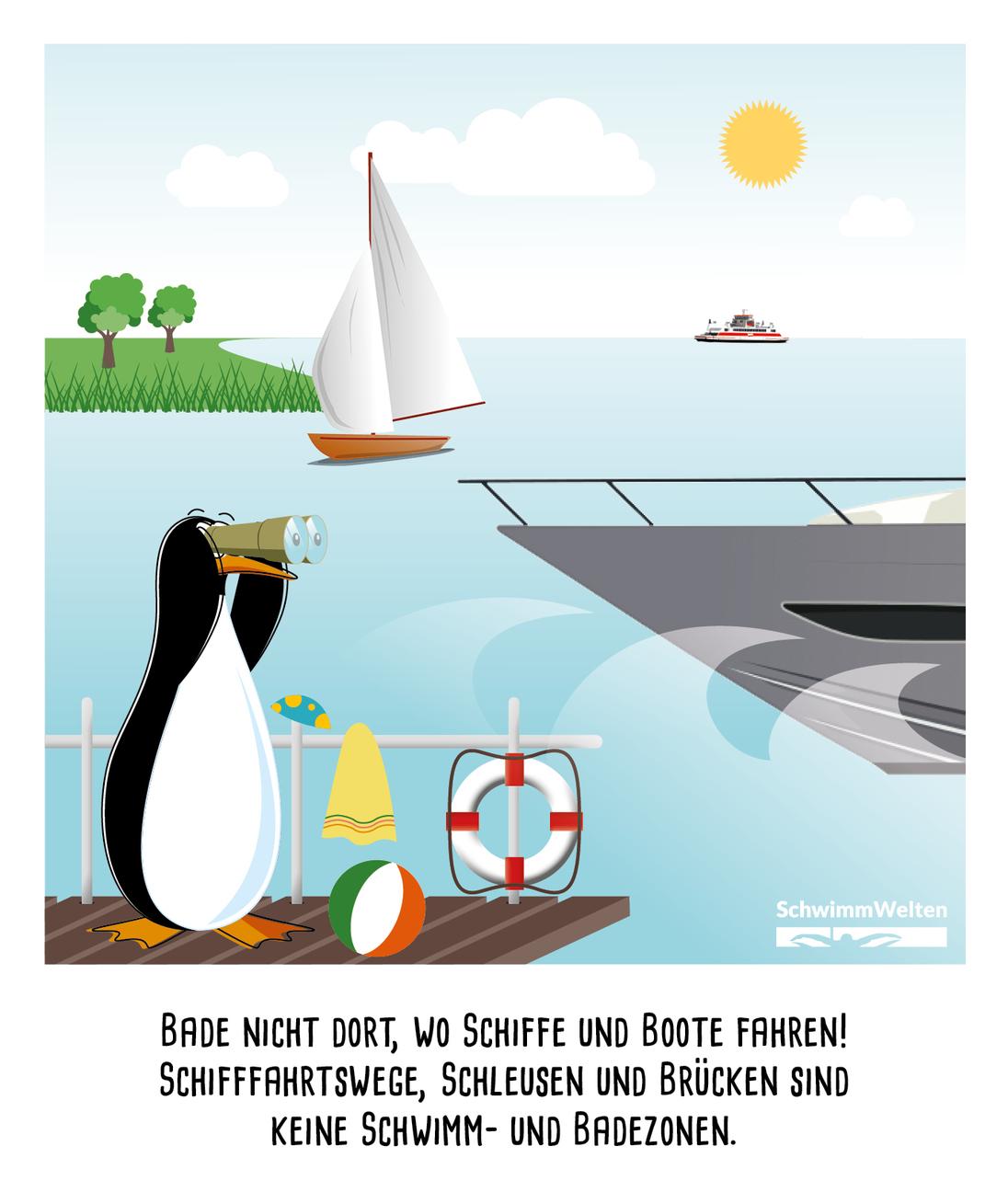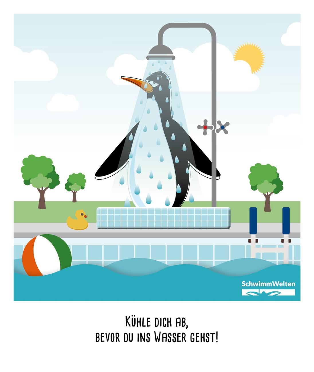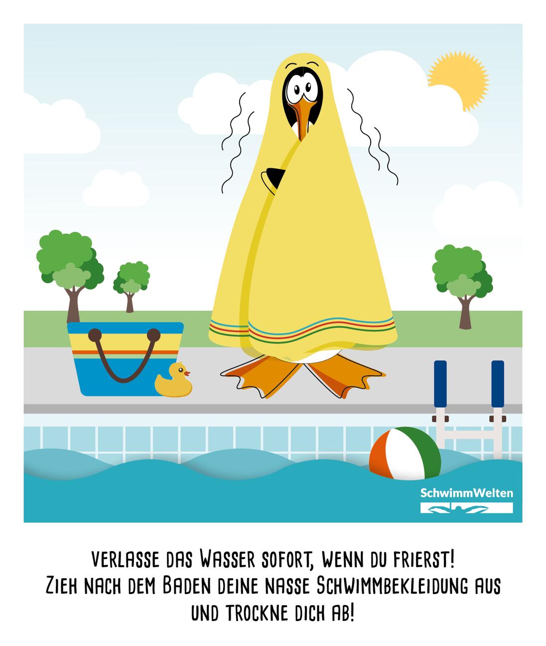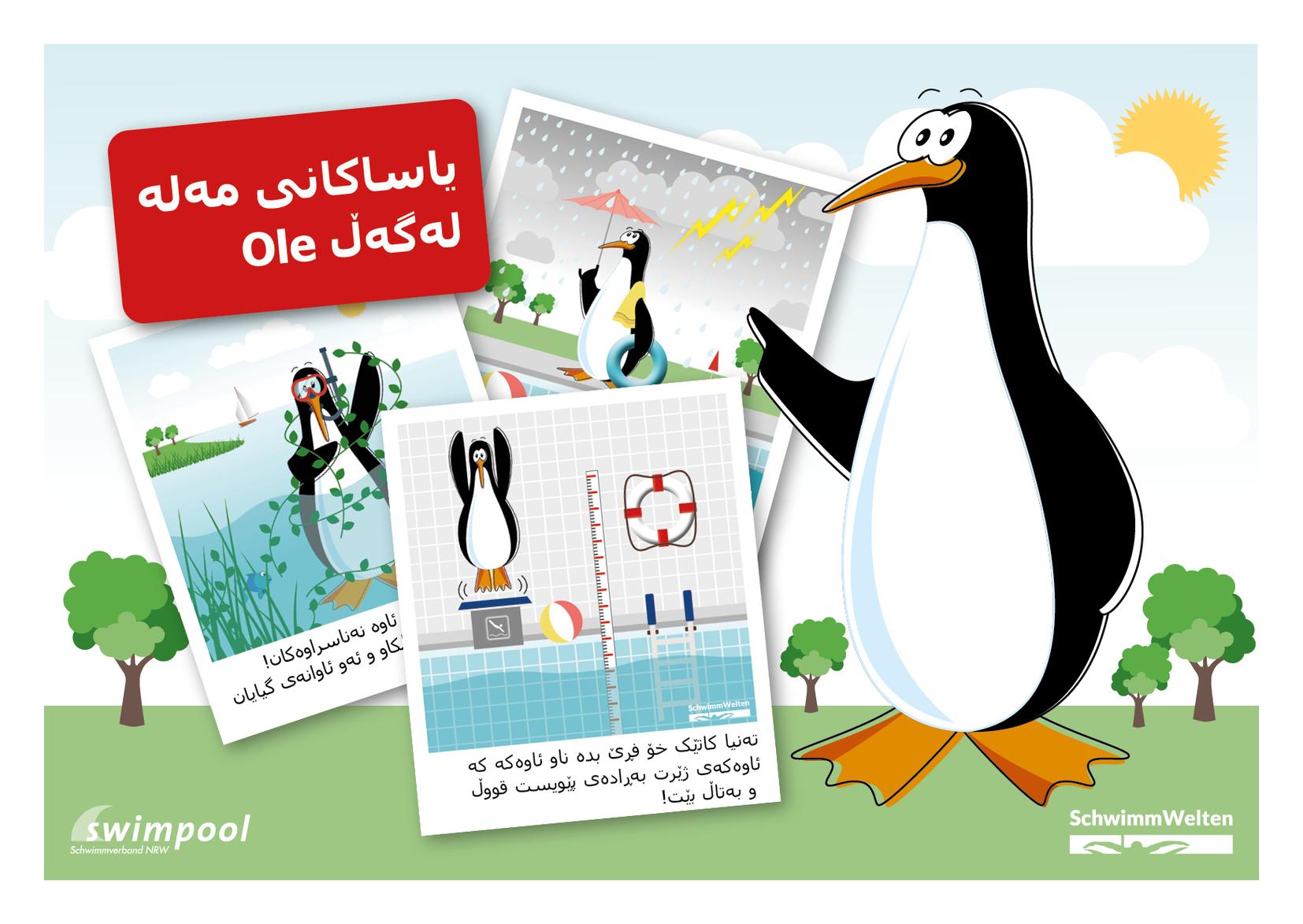 Hier findet ihr die wichtigsten Baderegeln, präsentiert von Pinguin Ole, dem Maskottchen des Schwimmverbandes Nordrhein-Westfalen.