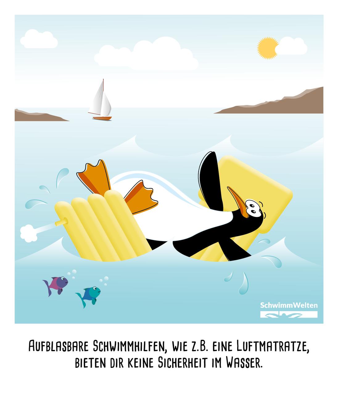 - Schwimmflügel, Schwimmtiere und Luftmatratze sind nicht sicher und schützen mich nicht vor dem Ertrinken.